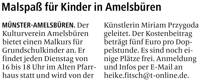 Anmeldungen sind ab sofort möglich bei Michael Messmann bzw. durch Überweisung des Unkostenbeitrags von 60,-€ /Kind an den Kulturverein Amelsbüren.