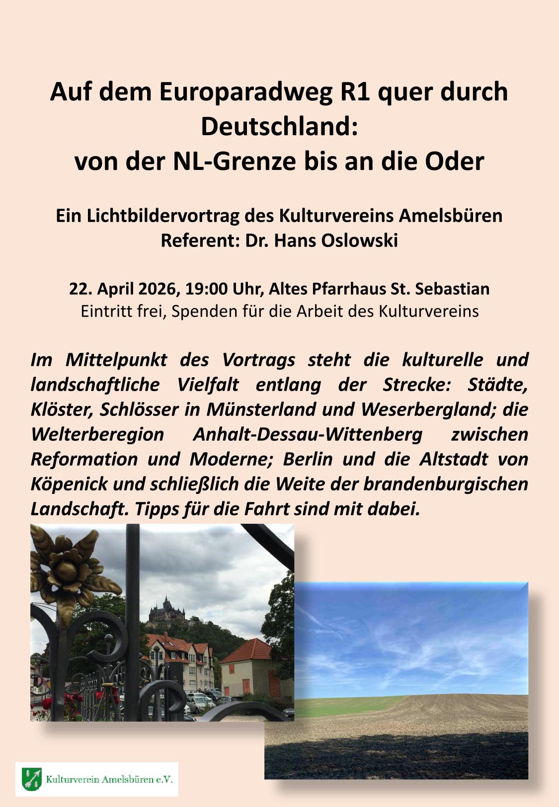 Von Calais bis nach St. Petersburg muss man nicht unbedingt radeln, um den Europaradweg R1 zu erfahren. Dessen Teilstrecke quer durch Deutschland ist überaus reizvoll und reich an landschaftlichen und kulturellen Schätzen. Vom Münsterland über den Harz und die Welterberegion Anhalt-Dessau-Wittenberg, durch die Altstadt von Köpenick und durch die Mark Brandenburg, bis nach Küstrin im Oderbruch führten die Etappen dieser Reise. Der Radweg R1 diente als Orientierung, doch oft gab es auch außerhalb der offiziellen Strecke Schätze zu entdecken.